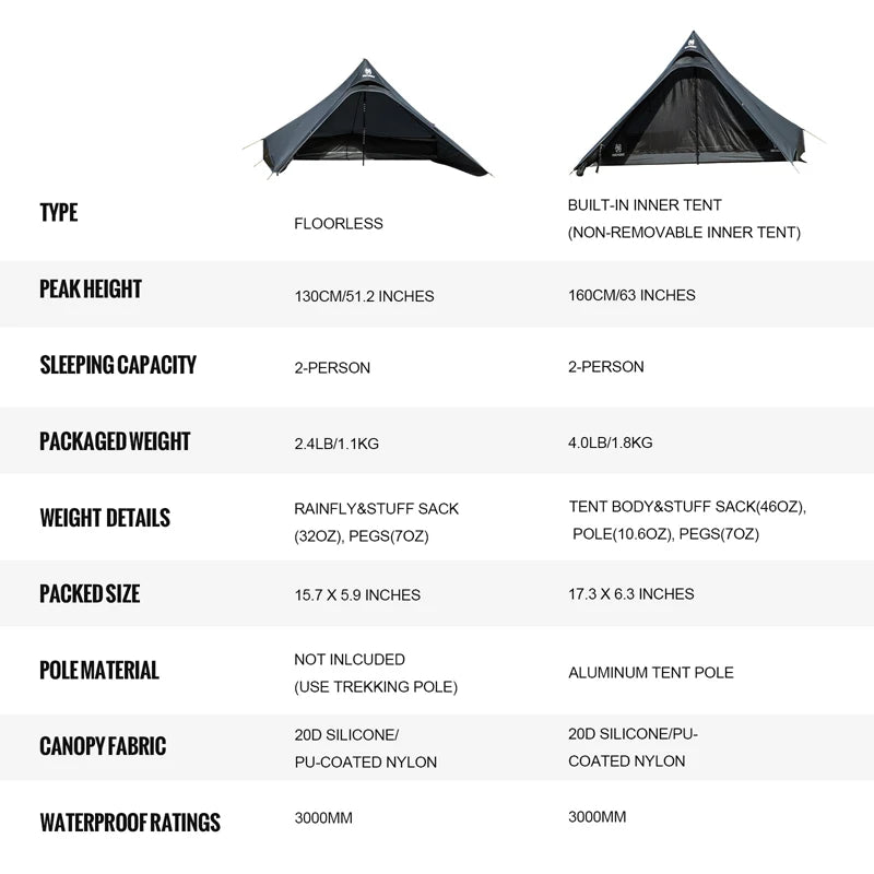 OneTigris TETRA Camping Tent 1-2 Person 3000mm Waterproofed Lightweight Backpacking Tipi Tent | Inner Mesh Tent Option Available