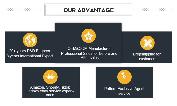 20+ years R&D Engneer 8 years International Export OEM&ODM Manufacturer Professional Sales for Before and After sales Dropshipping for customer Amazon, Shopify,Tiktok Ladaza ebay service experience Pattern Exclusive Agent service