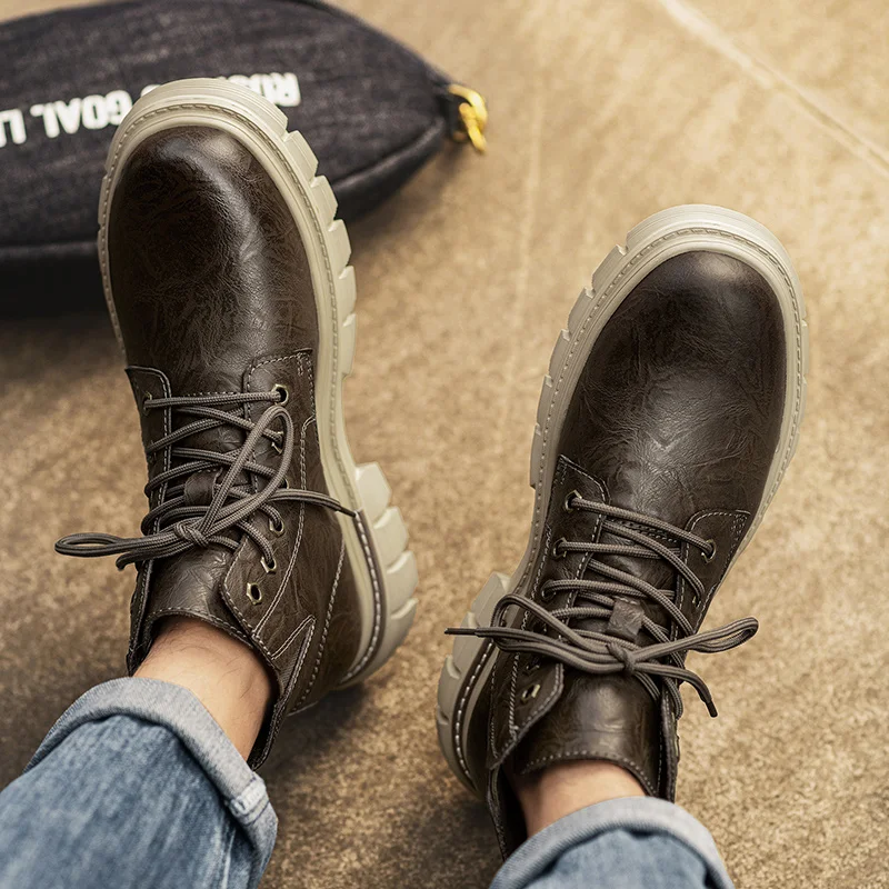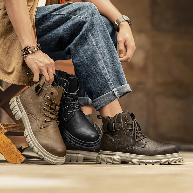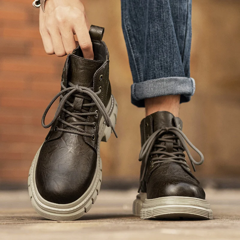 Outdoor Leather Ankle Boots Fashion Lace Up Motorcycle Boots Non-Slip Male Comfortable Botas 2025 New Arrival Men High Top Shoes