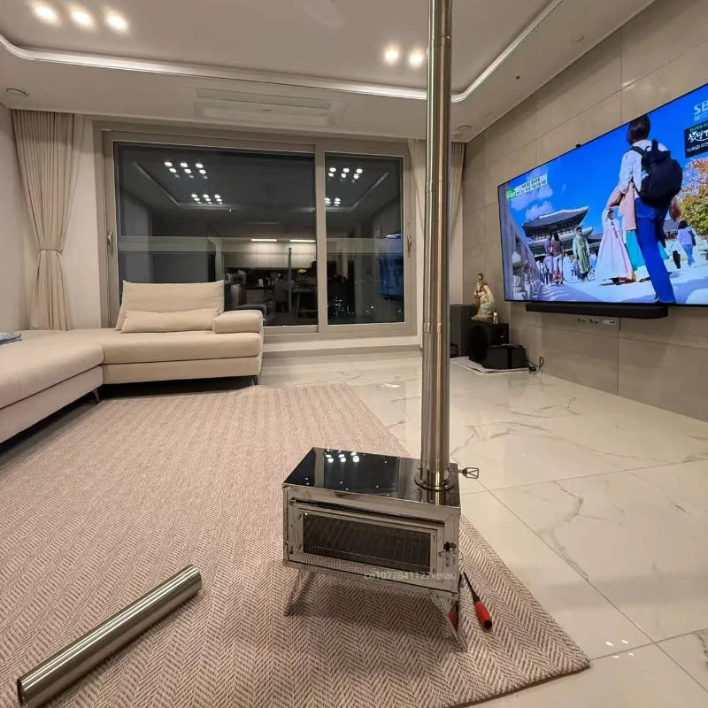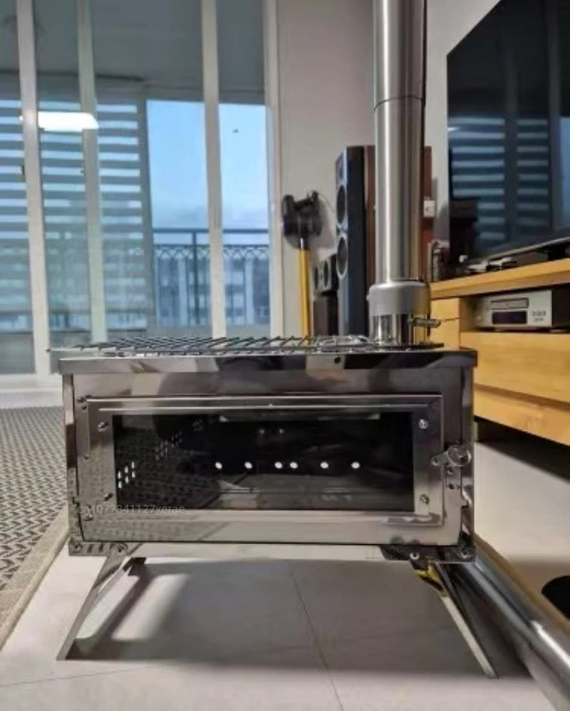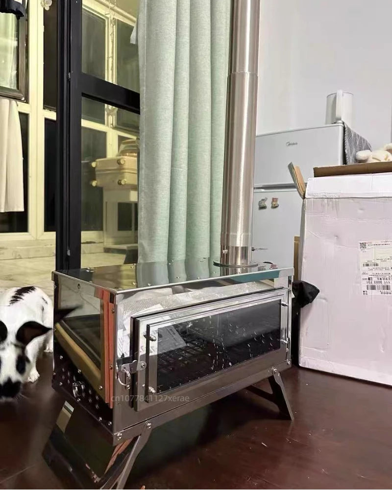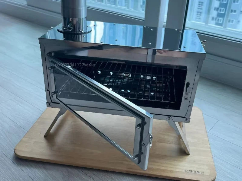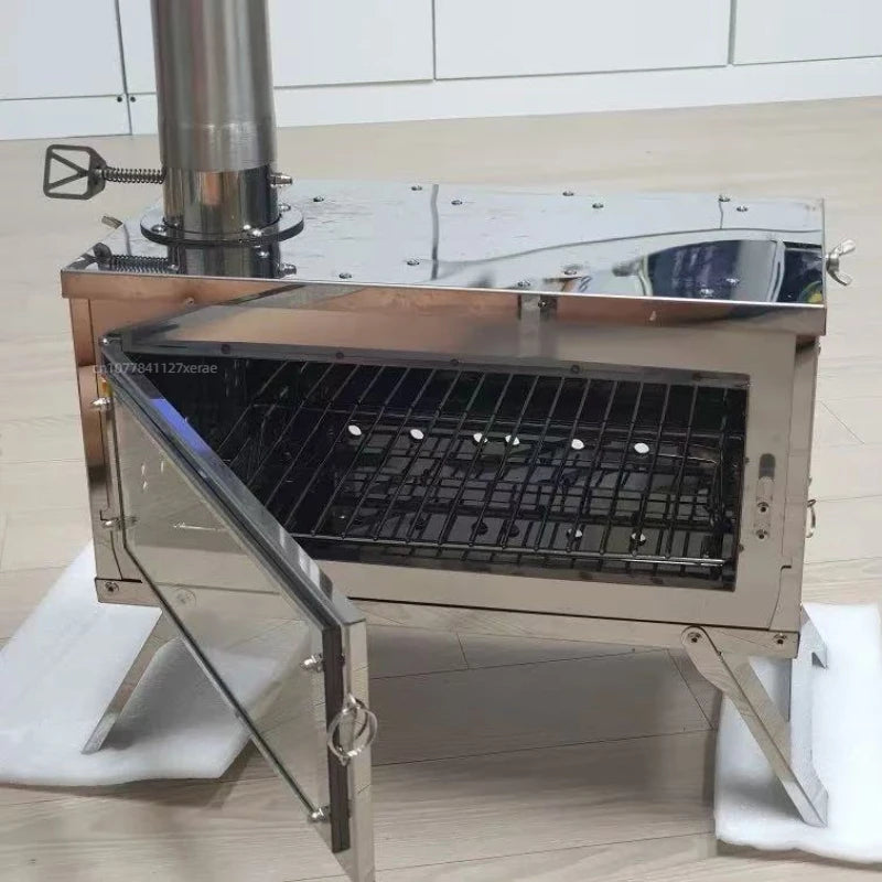 Outdoor tent camping, heat-resistant glass observation stove, portable foldable stainless steel winter heating wood stove