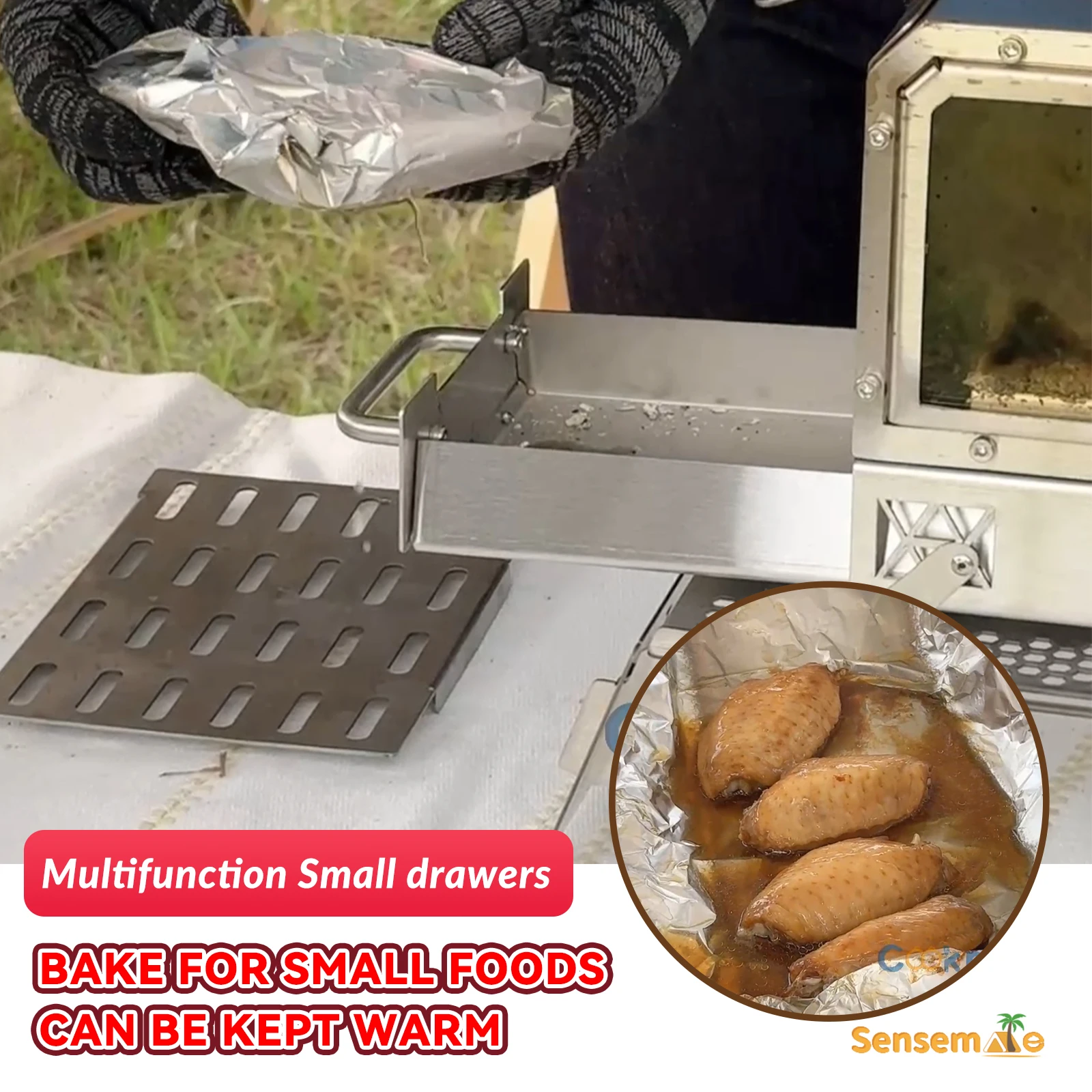 Side Mini Oven: Fits 4–6 chicken wings, small bread rolls, or veggie packets (max 200°C)—perfect for campfire snacks and desserts.