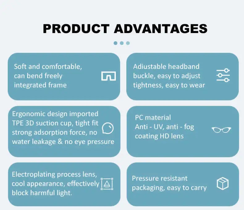 Headband: high-quality ultra elastic and environment-friendly silicone, with hole belt design, to prevent underwater displacement and reduce head discomfort after long-term use