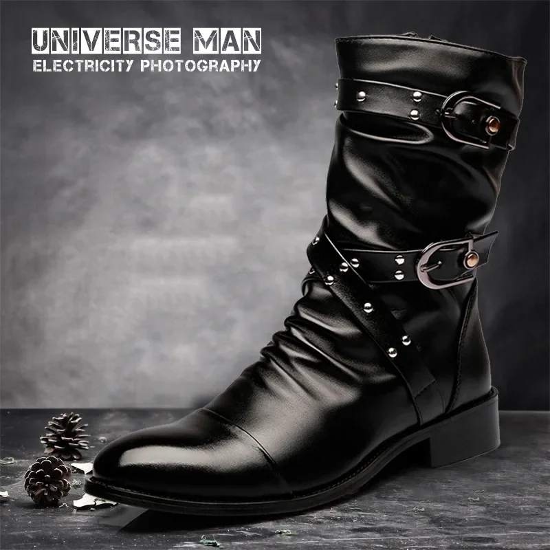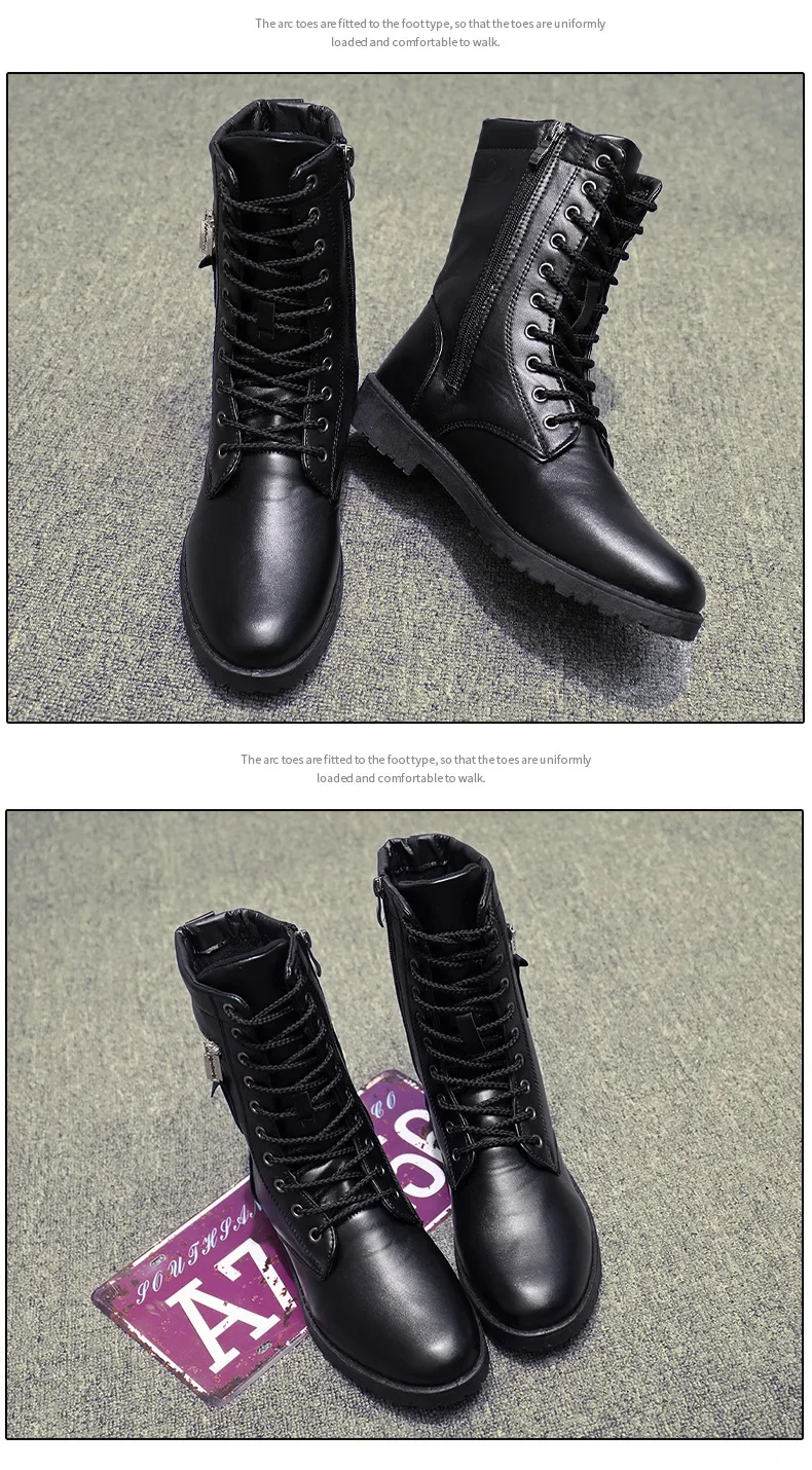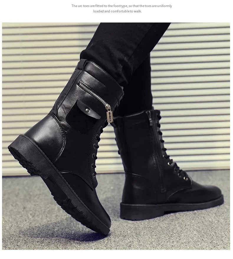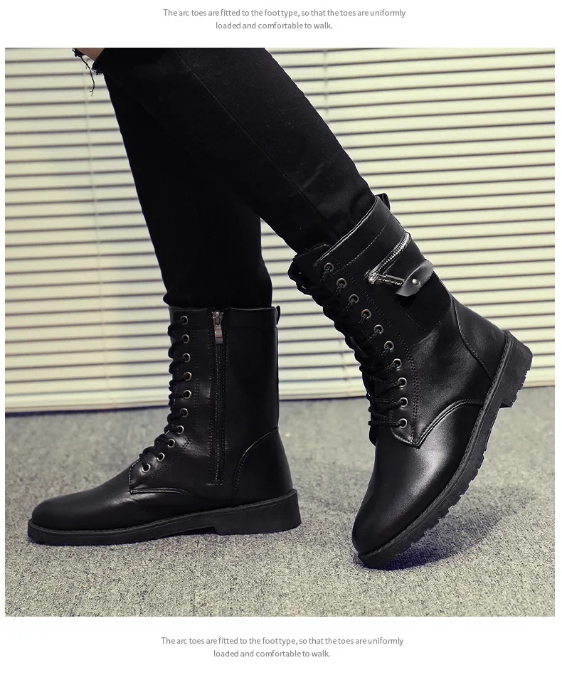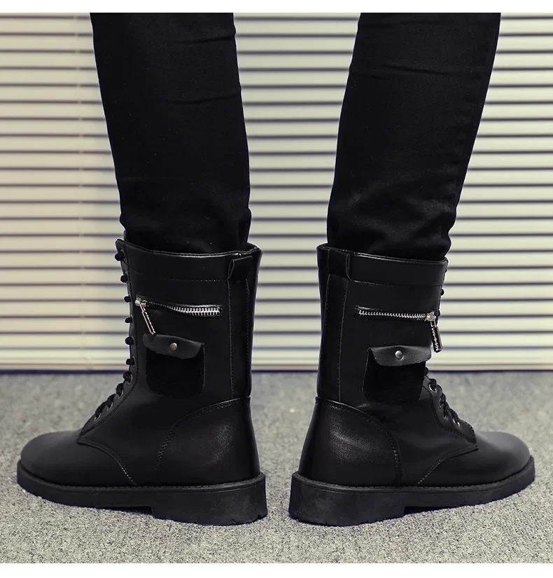 PU Leather Men Motorcycle Boots Men's Riding Hunting Walking Shoes Autumn Winter Mid-Calf Boots High Top Boots