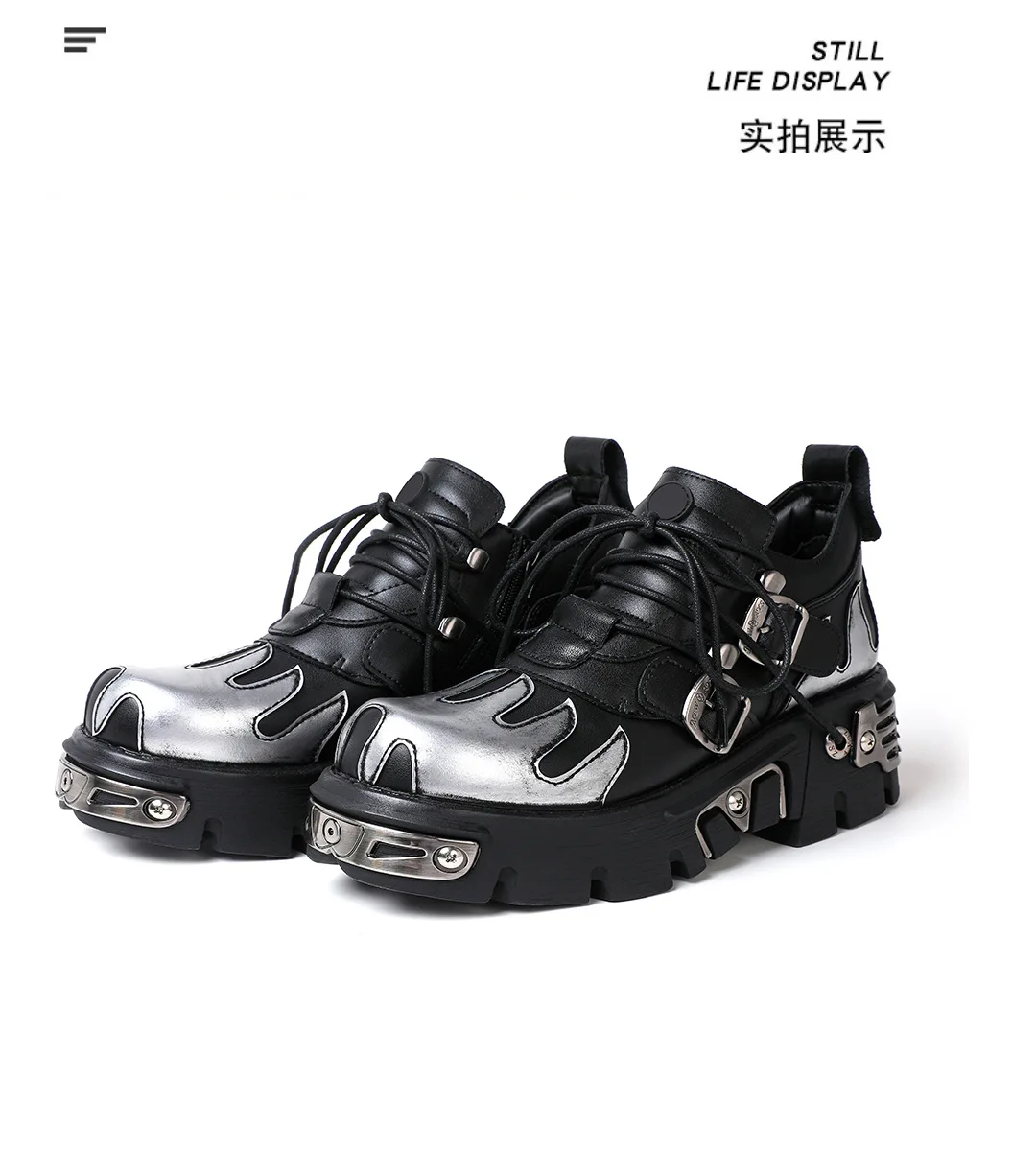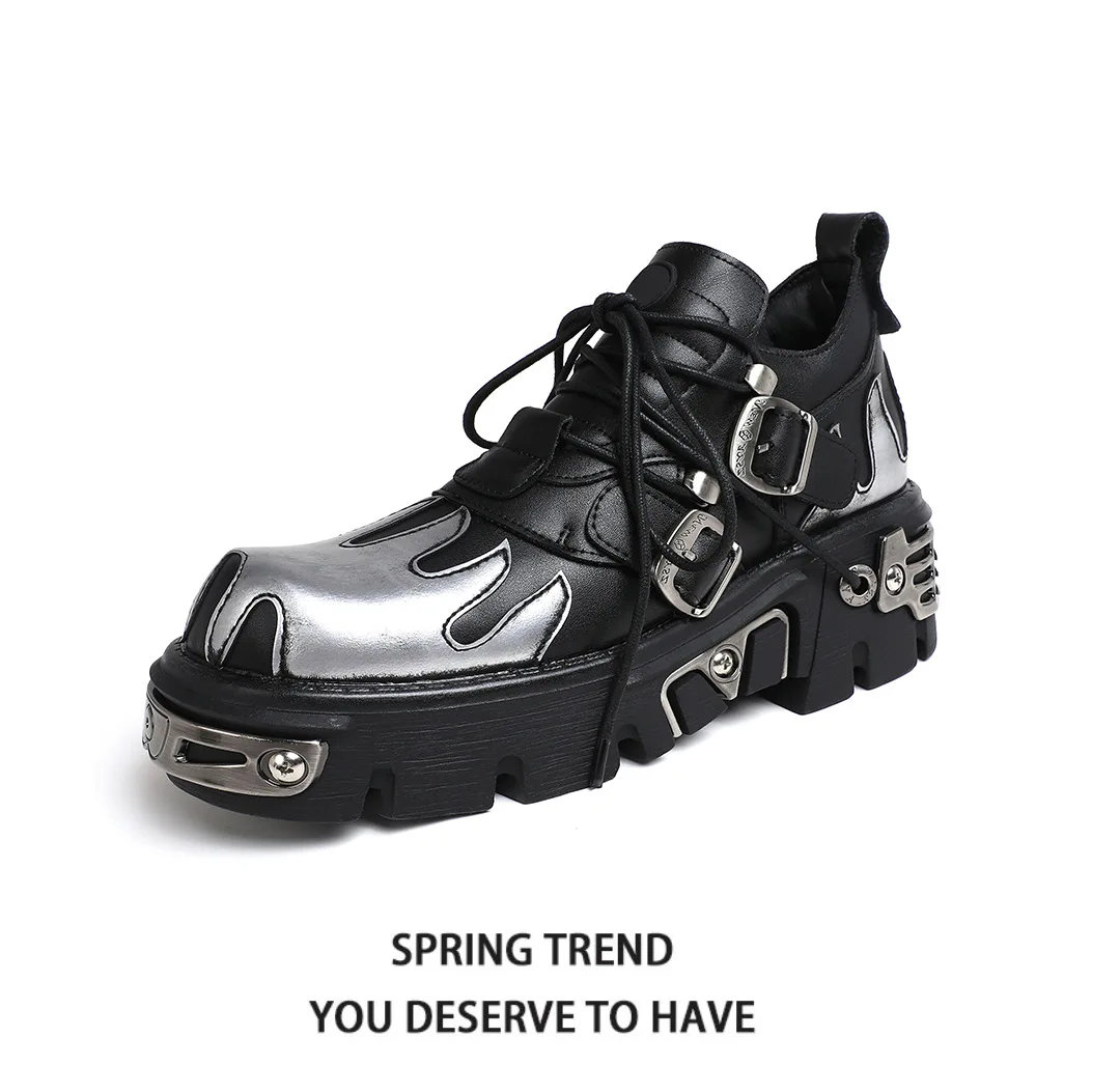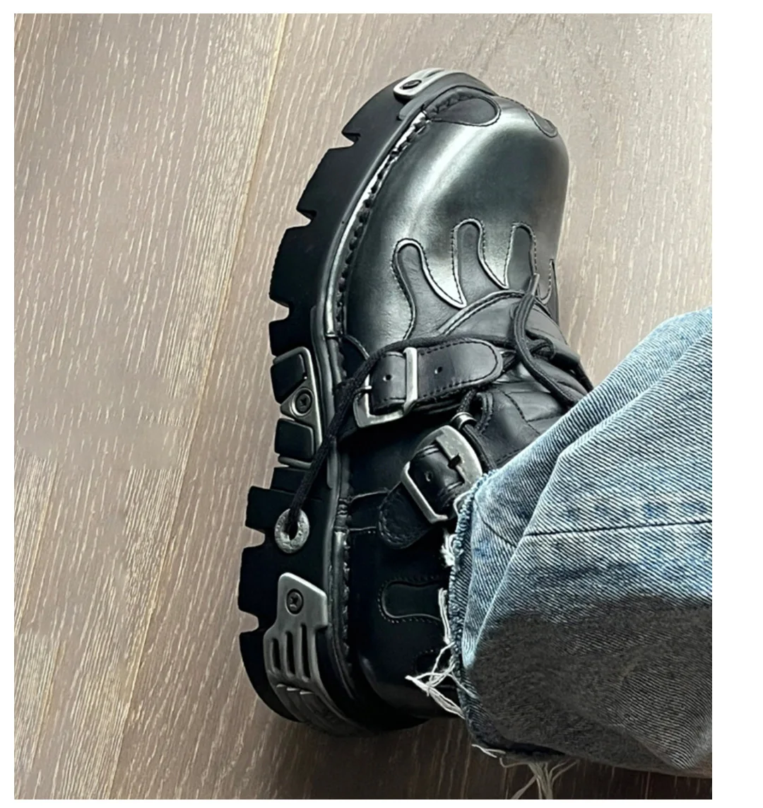 Retro flame carved dark punk small leather shoe with metallic design low cut thick sole single shoe racing shoe motorcycle boot