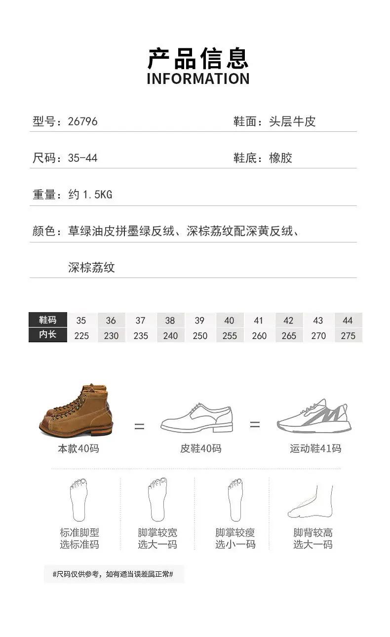 Note: After placing an order, please leave a message to note your actual foot length(cm), and we will give you reasonable suggestions, thank you!