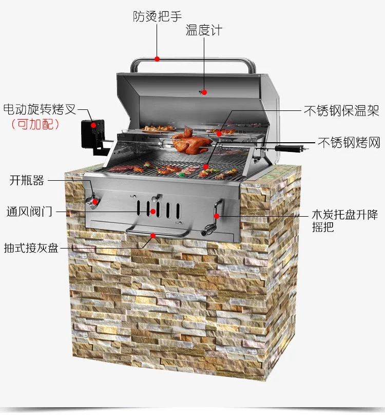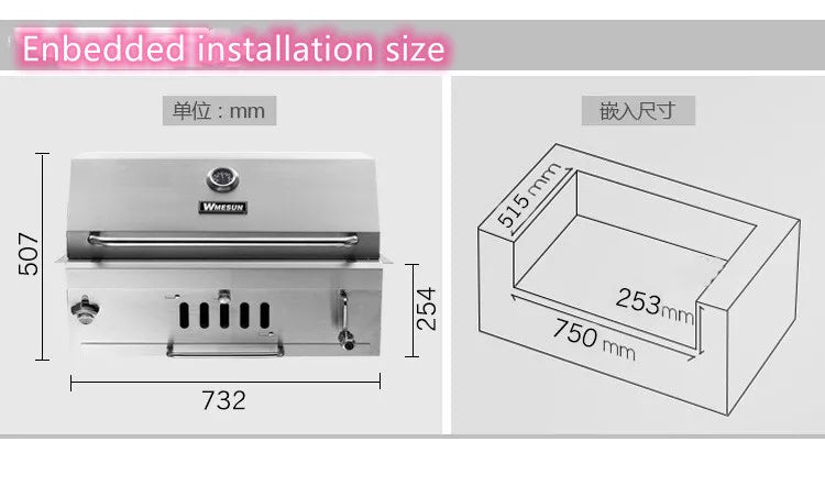 All stainless steel 304 embedded charcoal stove, stainless steel 202 barbecue net, material is 1.0-1.2 lifting charcoal plate Product size: 72*55*50.5cm Packing size: 78.5*64*57CM Net weight: 30KG Gross weight: 35.5KG