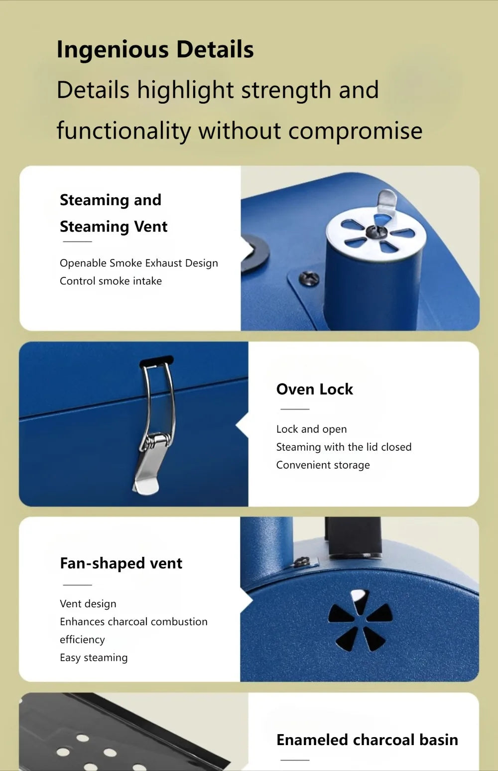 The fan-shaped vents enhance charcoal combustion and facilitate heat exhaust.