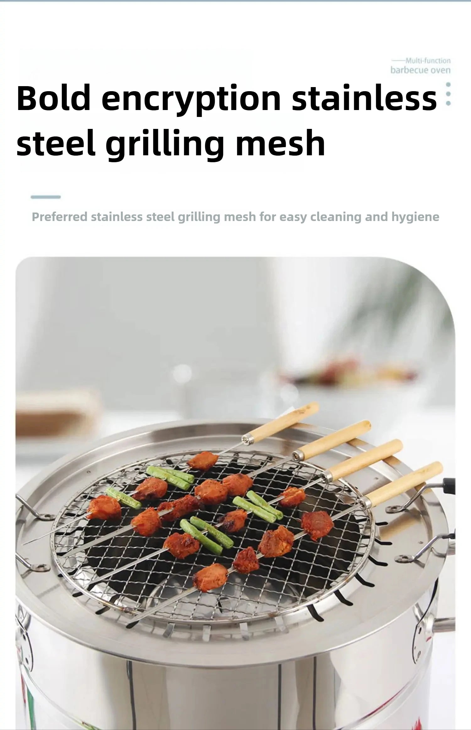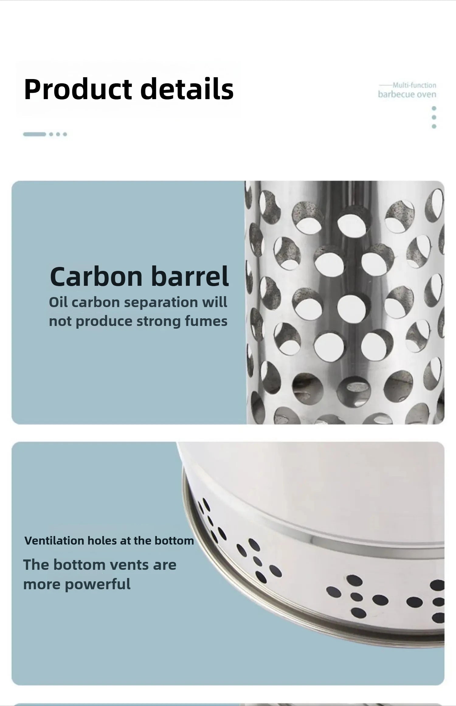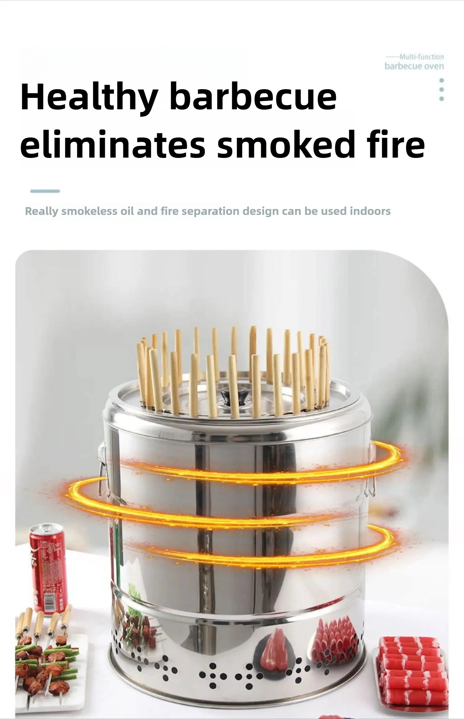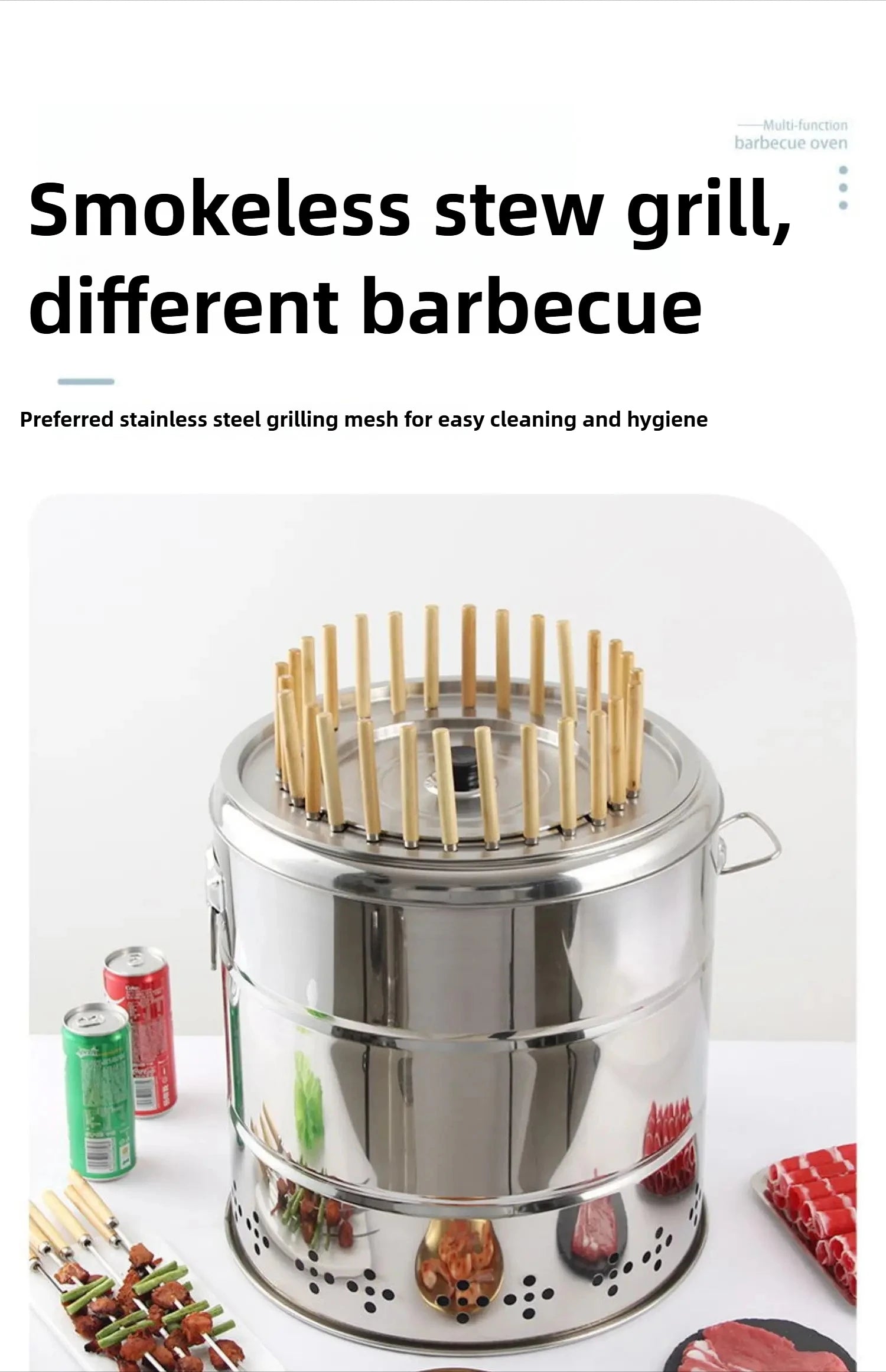 | smokeless BBQ grill, cylindrical charcoal grill, outdoor roaster, indoor barbecue grill, stainless steel BBQ, eco-friendly grill, quick-heating BBQ, portable charcoal grill, durable grilling rack, charcoal barbecue smoker |