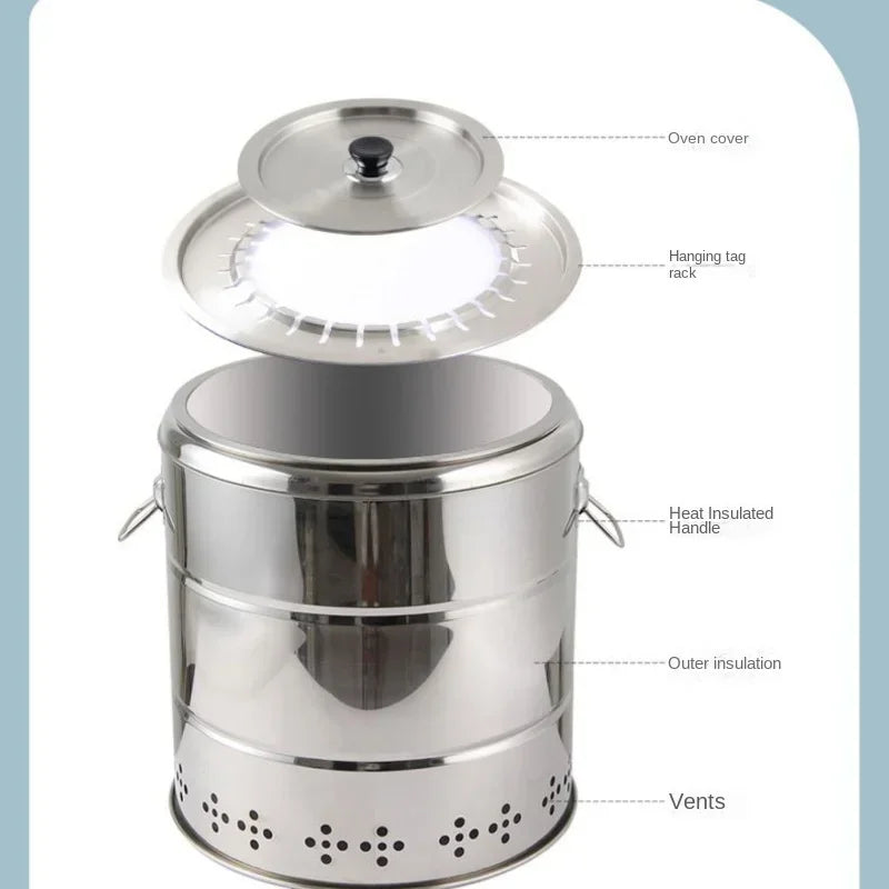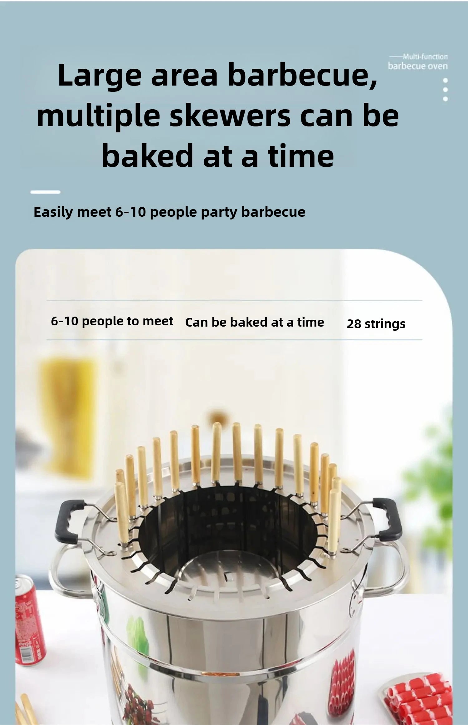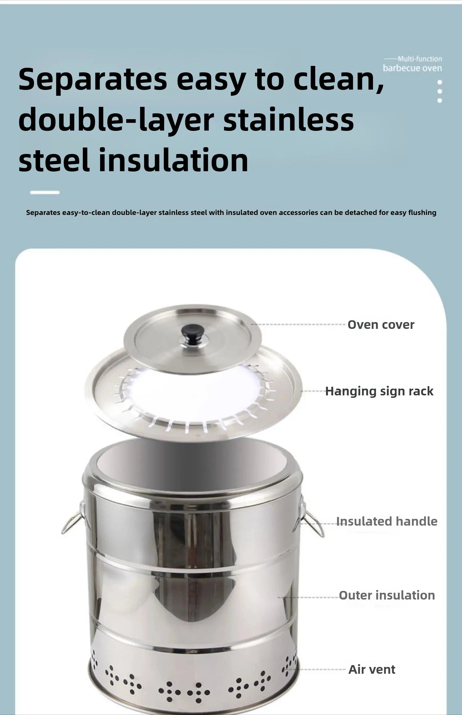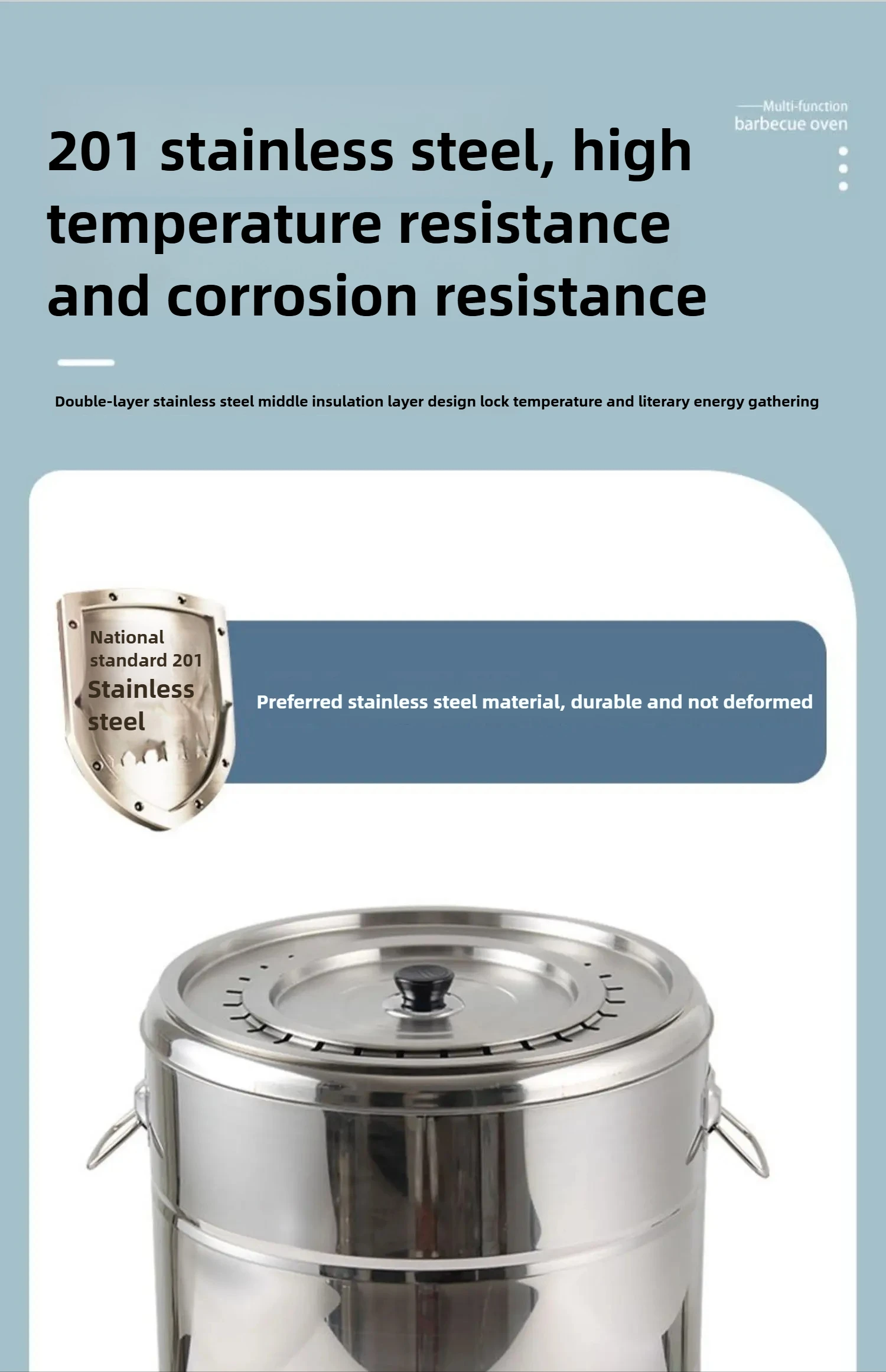 | smokeless BBQ grill, cylindrical charcoal grill, outdoor roaster, indoor barbecue grill, stainless steel BBQ, eco-friendly grill, quick-heating BBQ, portable charcoal grill, durable grilling rack, charcoal barbecue smoker |