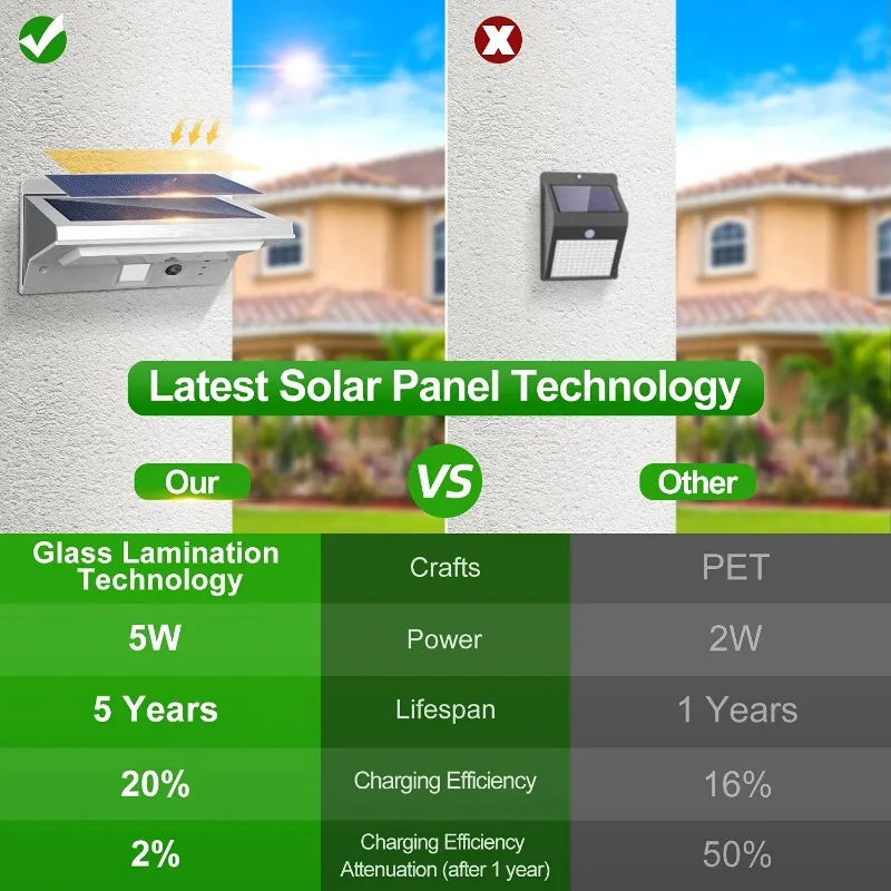 Glass Lamination Solar Panels: Compare to other solar outdoor lights with PET solar panels in the market, our solar light has better charging efficiency and less attenuation year by year. Which means that the lifespan of our solar light is 5 times longer than other similar solar lights