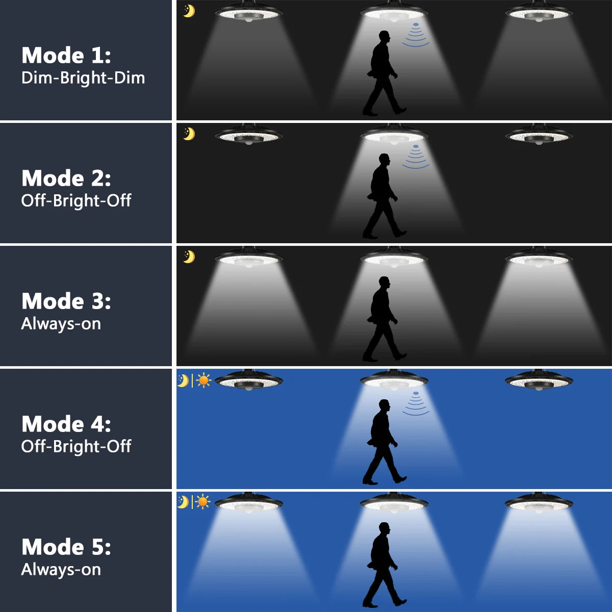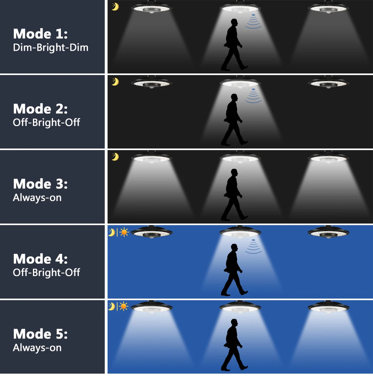 【5 Light Modes & Motion Sensor, 2 for All-Day Lighting】--Our solar light is better than traditional ones. Our solar light has 2 reliable modes for lighting dim indoor spaces all day. Just pick mode 4 or mode 5(auto mode). Mode 4: Only motion activates high-brightness lights; Mode 5: Lights on all day, switch to Mode 4 at 50% battery. Also, the solar light has 3 dusk to dawn modes: 2 with motion sensor and 1 with constant light.