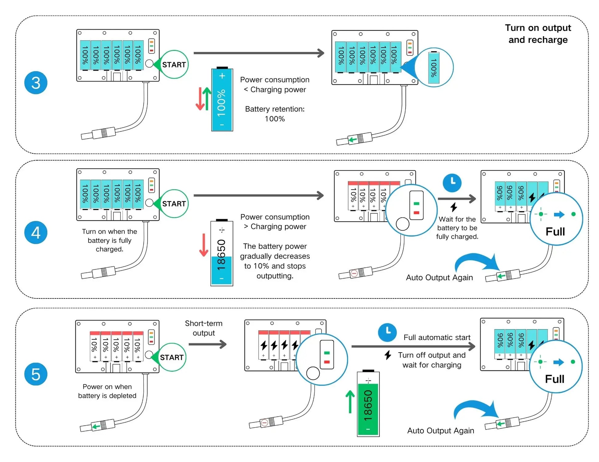 When the power consumption of your device is greater than the power generated by the solar panel, the battery power will gradually decrease until it reaches around 10% (3.4-3.5V), at which point the output will stop. At this time, the solar panel will wait for the battery to be charged, which may take 14-16 hours. Once the battery is recharged to 90% (4V), the solar panel will automatically resume output.