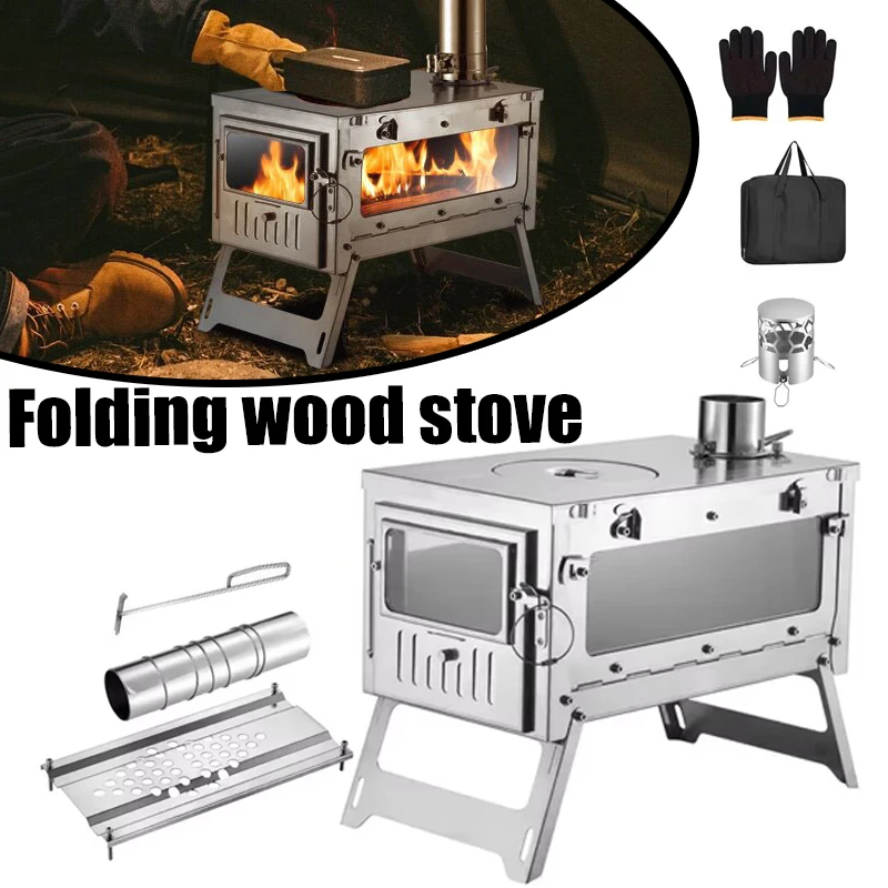 430 Stainless Steel Portable Tent Stove Foldable with Side Glass Chimney Burner Camping Wood Stove Heating Cooking Grill