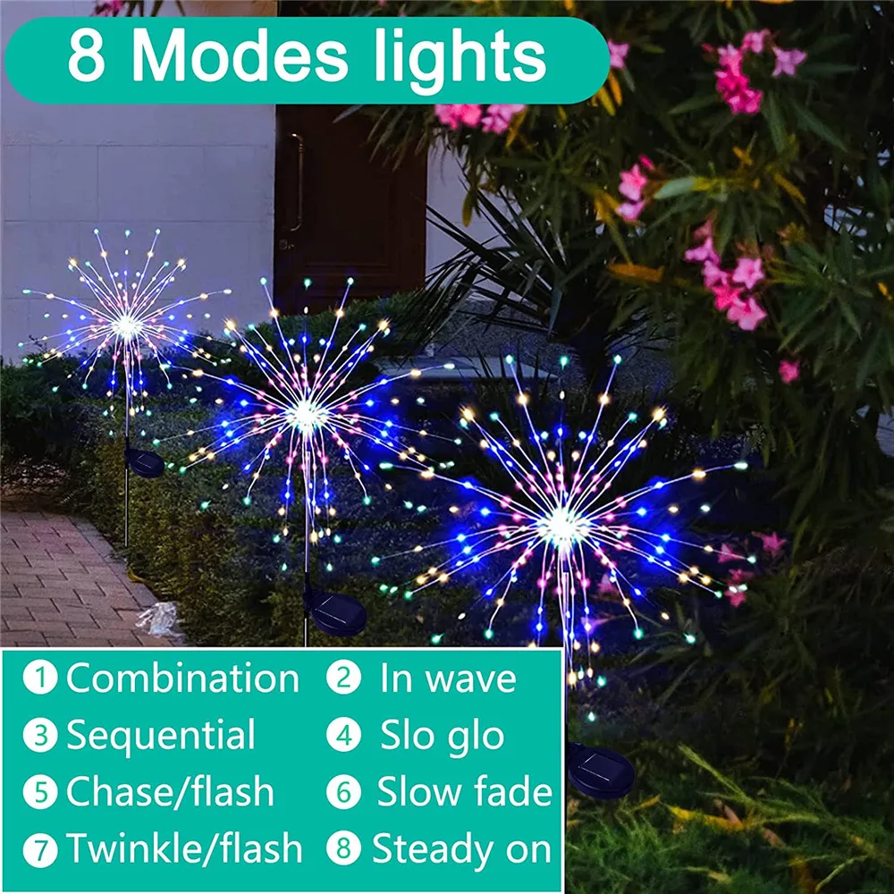 This solar firework lights use upgraded solar panel and build-in high-capacity battery which means our solar outdoor lights can effectively collect more sunlight and store more electrical energy,charging for 4-6hours under sunlight can continuous illuminate 8-10 hrs,which greatly meets your needs for long Lighting time
