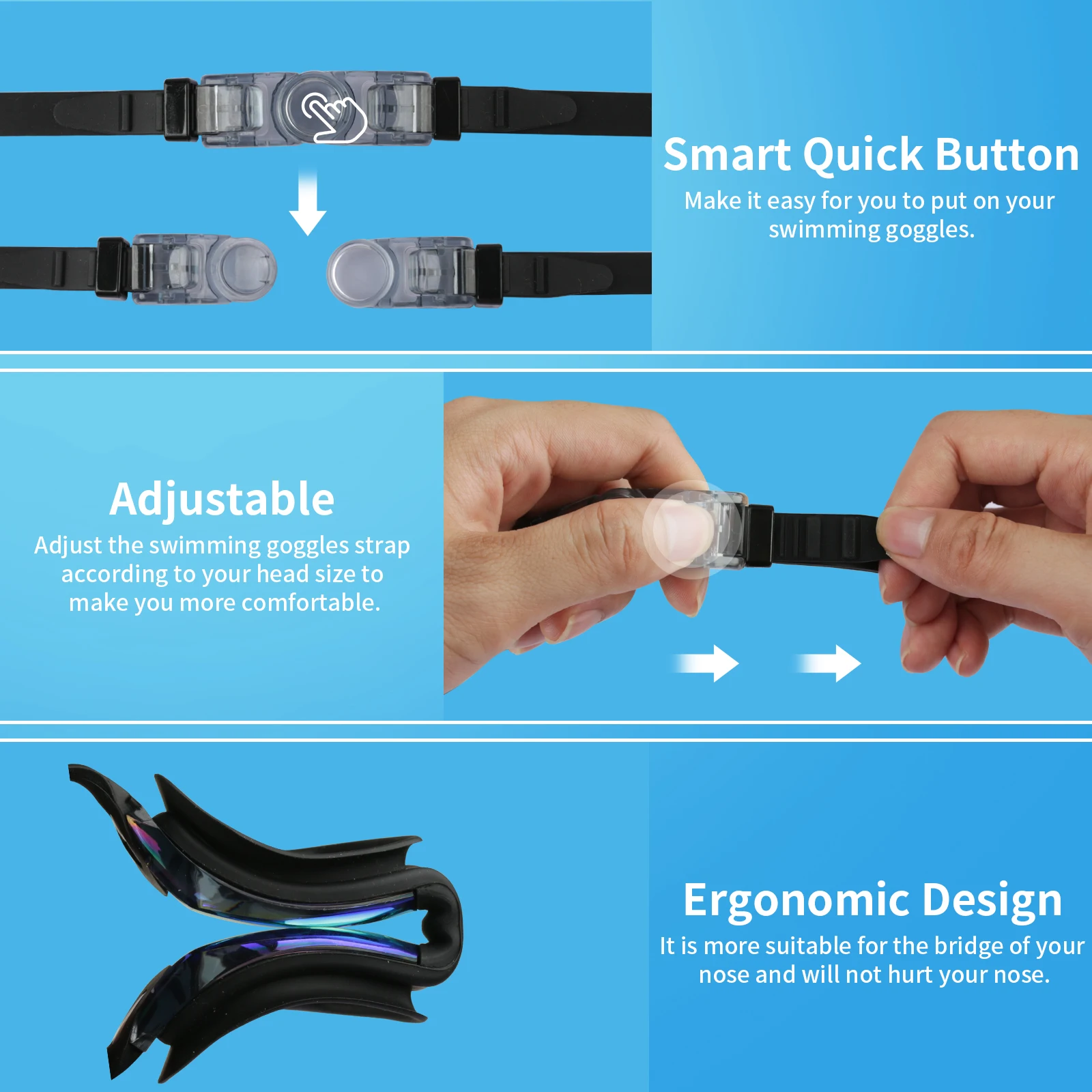 COMFORTABLE AND EASY TO ADJUST: The goggles swimming adult straps are made of soft high quality silicone, easy to adjust for tightness and easy to release. the flexible silicone frame and improved higher nose rest provide extreme comfort and will never hurt your nose or leave marks on your face.