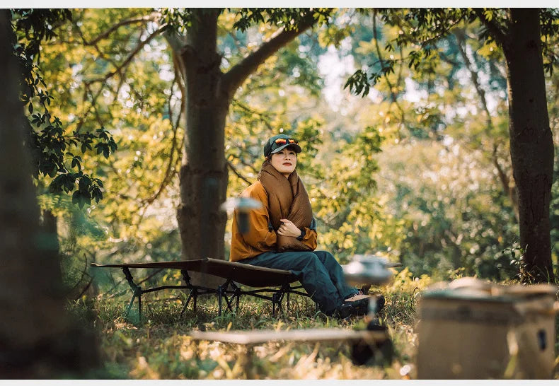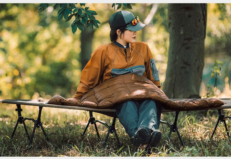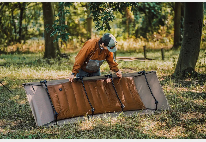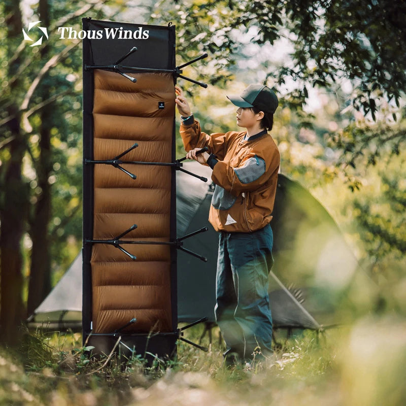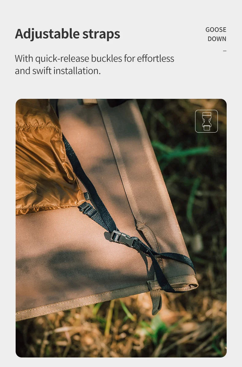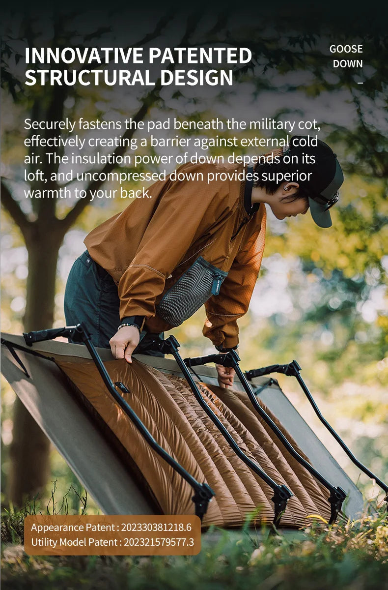 This Cot Down Backing is designed specifically for outdoor camping cots. It features 800+FP water-resistant white goose down for maximum fluffiness and insulation. By securing this pad under your cot, it effectively creates a barrier against external cold air, keeping your back warm. The insulation power of down comes from its loft, and uncompressed down delivers superior warmth to your back.