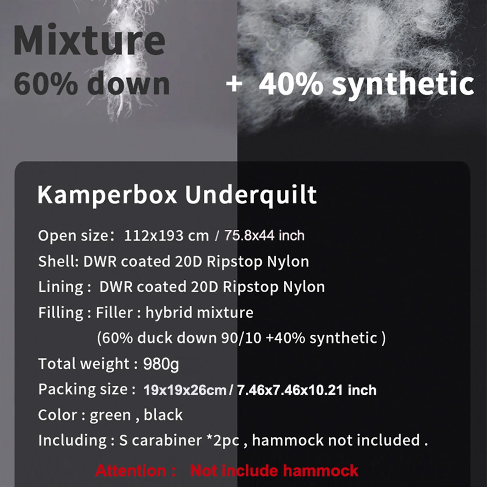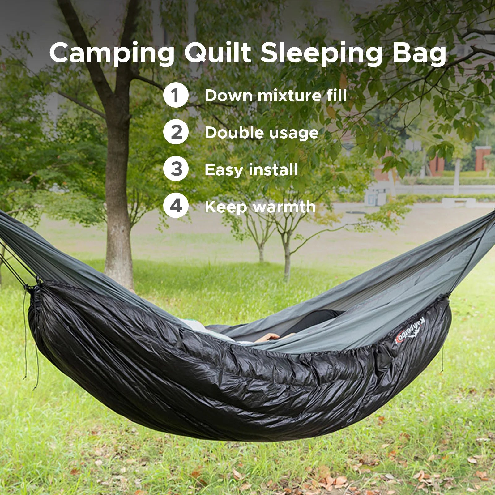 1、Weighing only 980g, this quilt is incredibly lightweight, making it perfect for backpacking and long hikes. 2、Filled with 60% duck down and 40% synthetic, this quilt offers exceptional warmth while remaining lightweight. 3、Whether you’re camping in milder weather or facing a chilly night, this quilt will keep you comfortable and safe. 4、The hanging ropes at both ends of the quilt can be tightened to prevent cold wind from entering and keep warm. 5、The two attached S-shaped buckles can firmly fix the quilt and prevent it from falling apart.