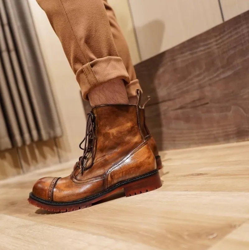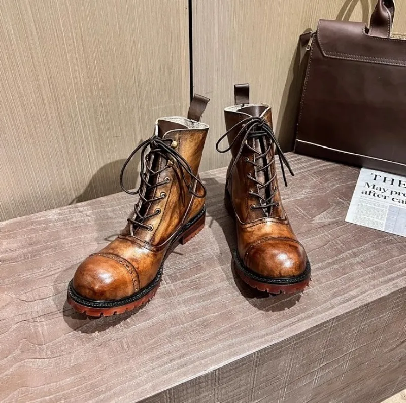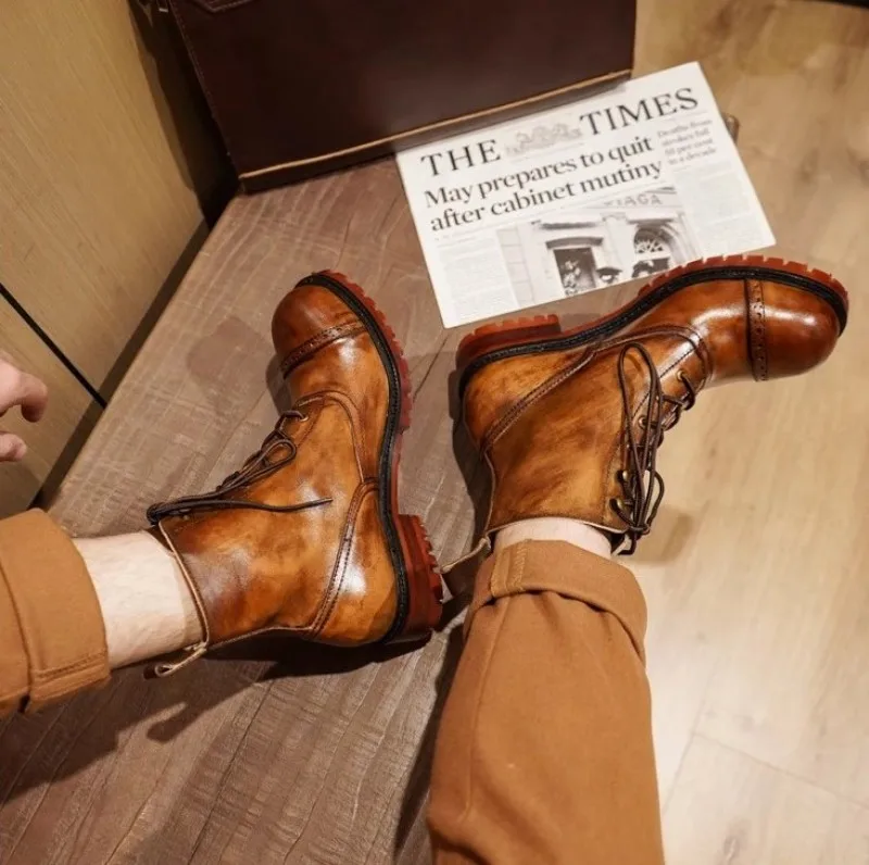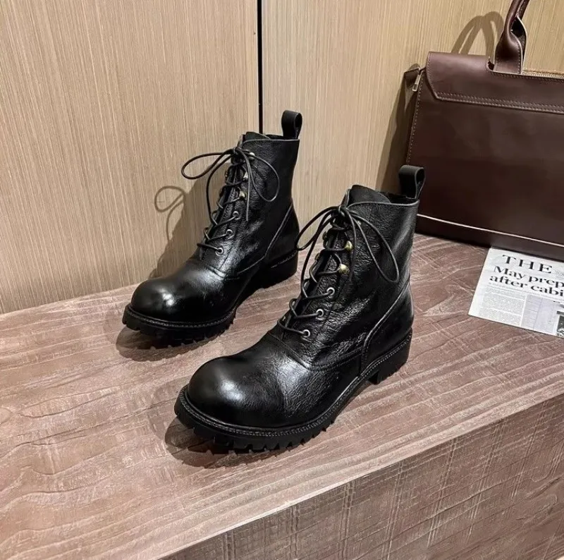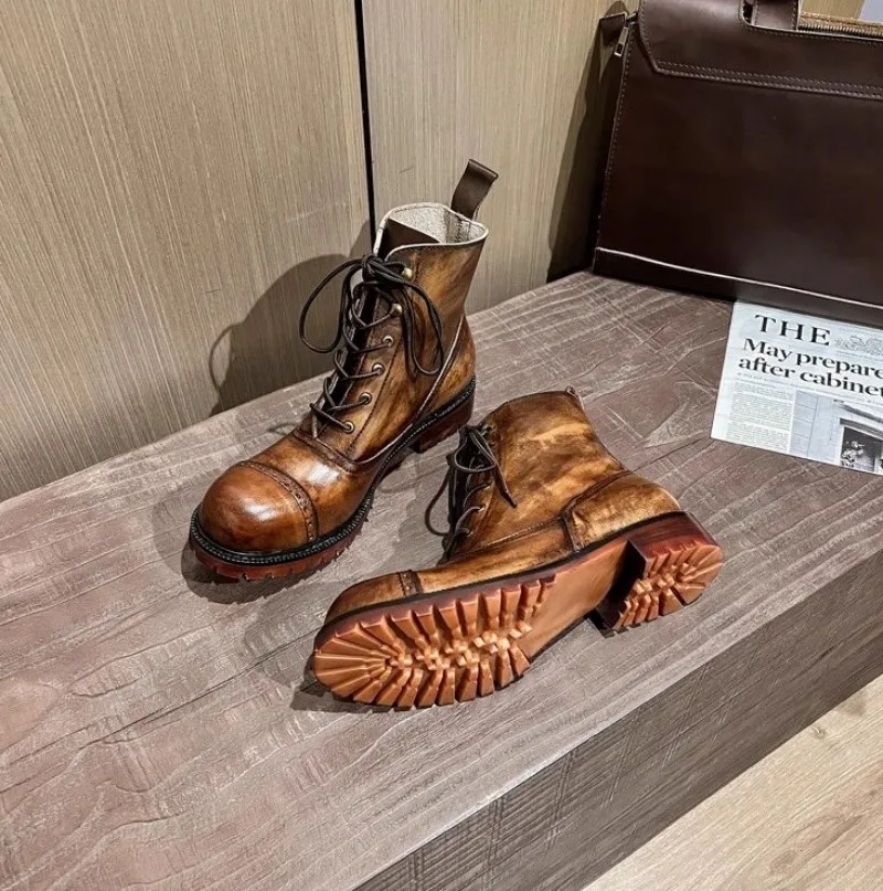 Vintage Mens Round Toe Lace Up High Top Work Safety Shoes Cowhide Genuine Leather Ankle Boots British Motorcycle Riding Boots 45