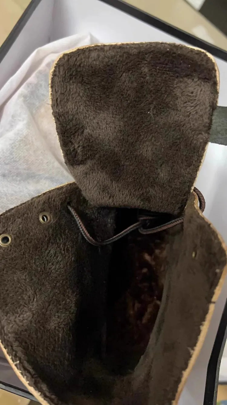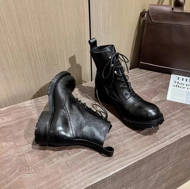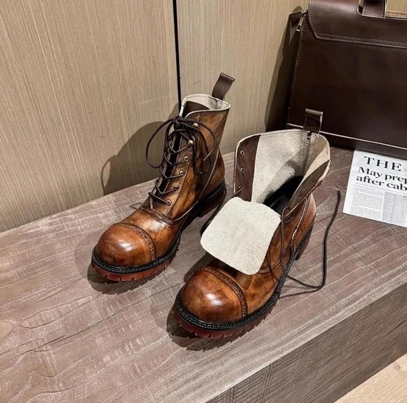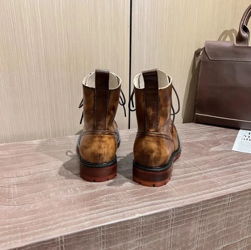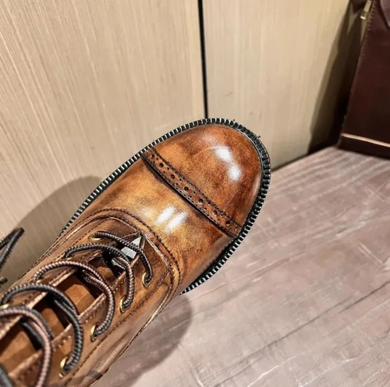 Vintage Mens Round Toe Lace Up High Top Work Safety Shoes Cowhide Genuine Leather Ankle Boots British Motorcycle Riding Boots 45