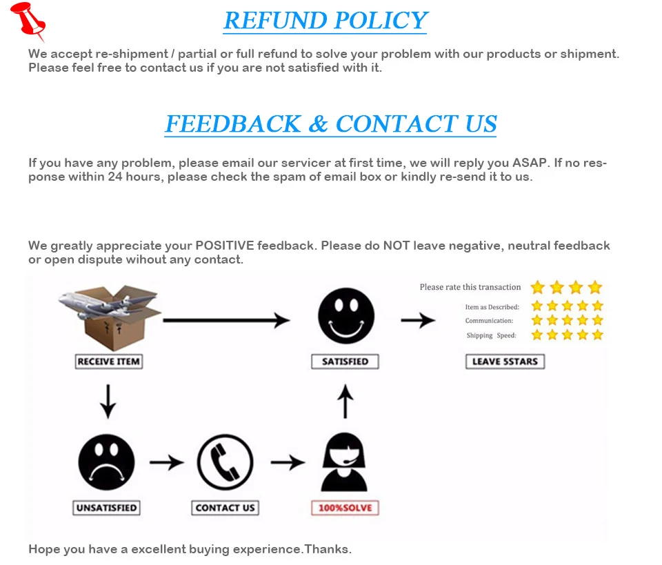 3. If you have any problem about the product/order please feel free to contact us in the first time, we'll try our best to give you a satisfactory solution.