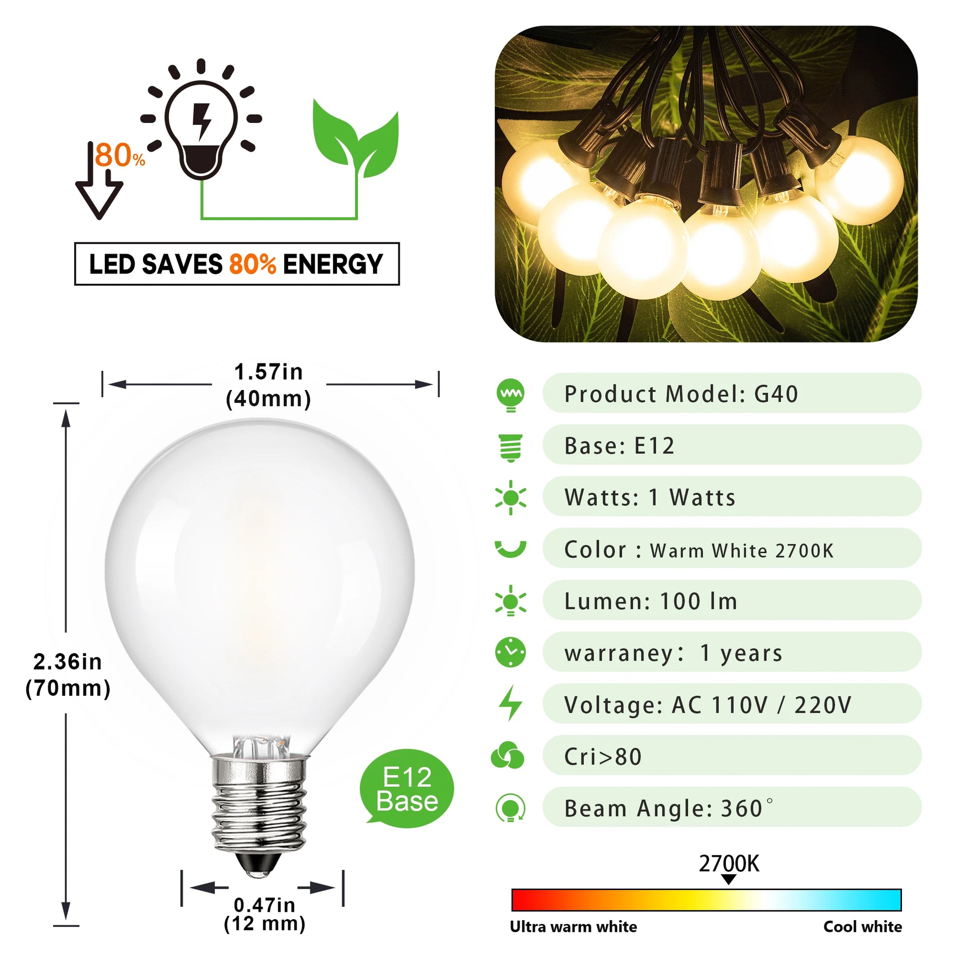 【Easy to install】This 2700K warm white g40 LED bulb is easy to install, and suitable for all lamps with E12 string light base, vintage style and edison screw. Plug and Play.