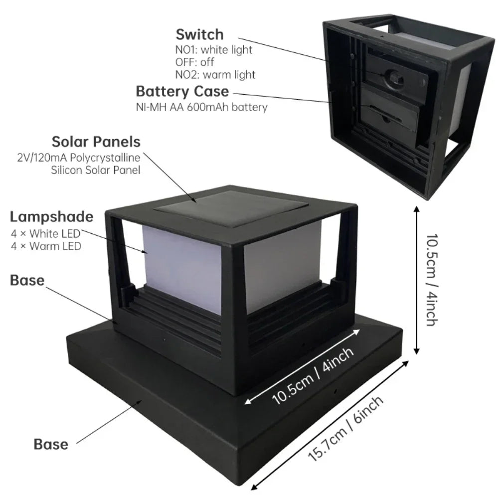 【Outdoor Waterproof】Outdoor waterproof post light does not succumb to harsh outdoor environment, so you have no worries in rain, snow, wind and frost. Quick and easy installation without wiring.【Double Light Source】Three-speed two-color switch (No1 white light-OFF (off)-No2 warm light), one lamp can achieve white light or warm light, choose the light color you are used to, applicable column size: 4-6 inches