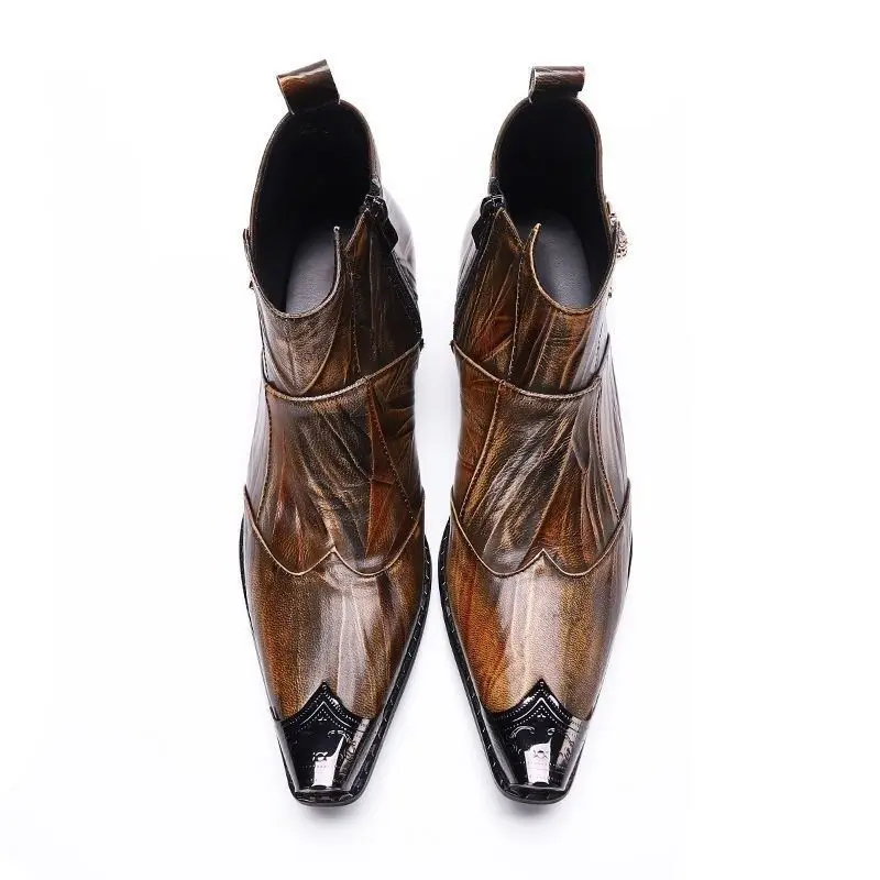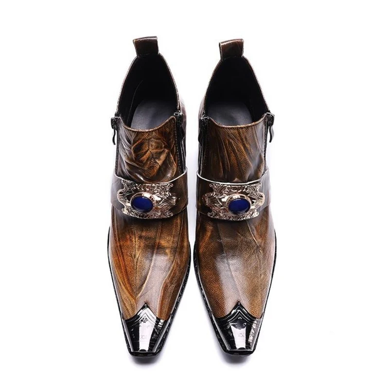 Western men's booties leather shoes pointy brown leather ankle boots men's zipper 6.5cm high heels motorcycle shoes