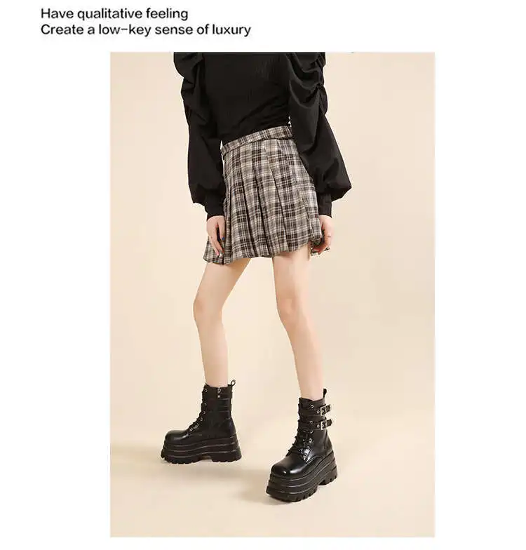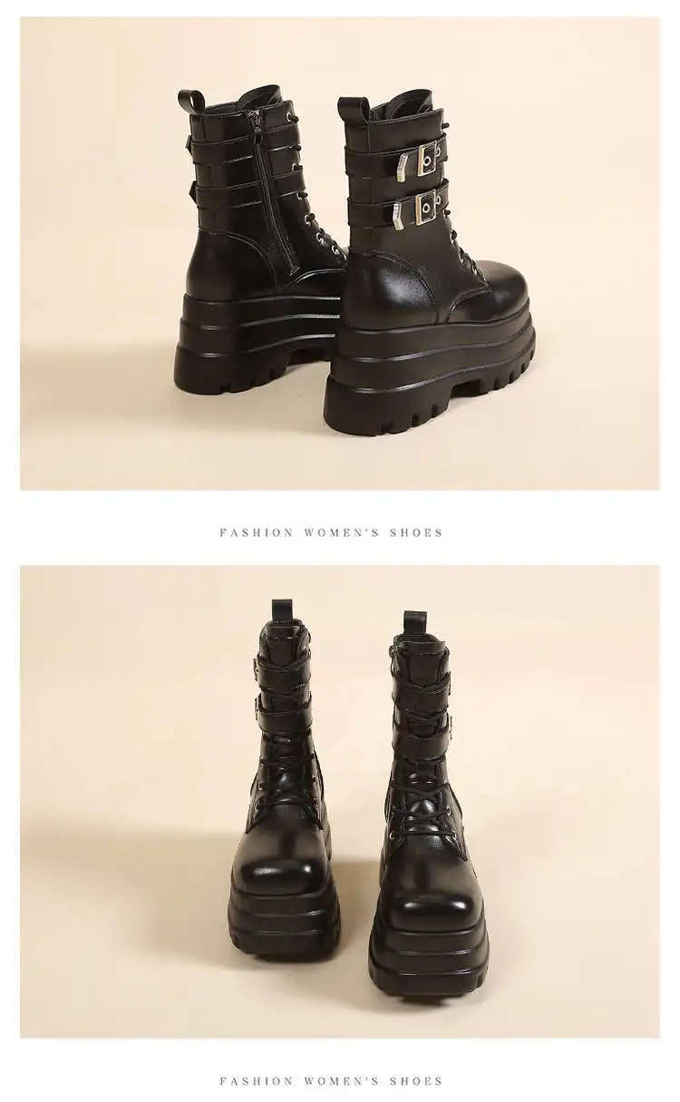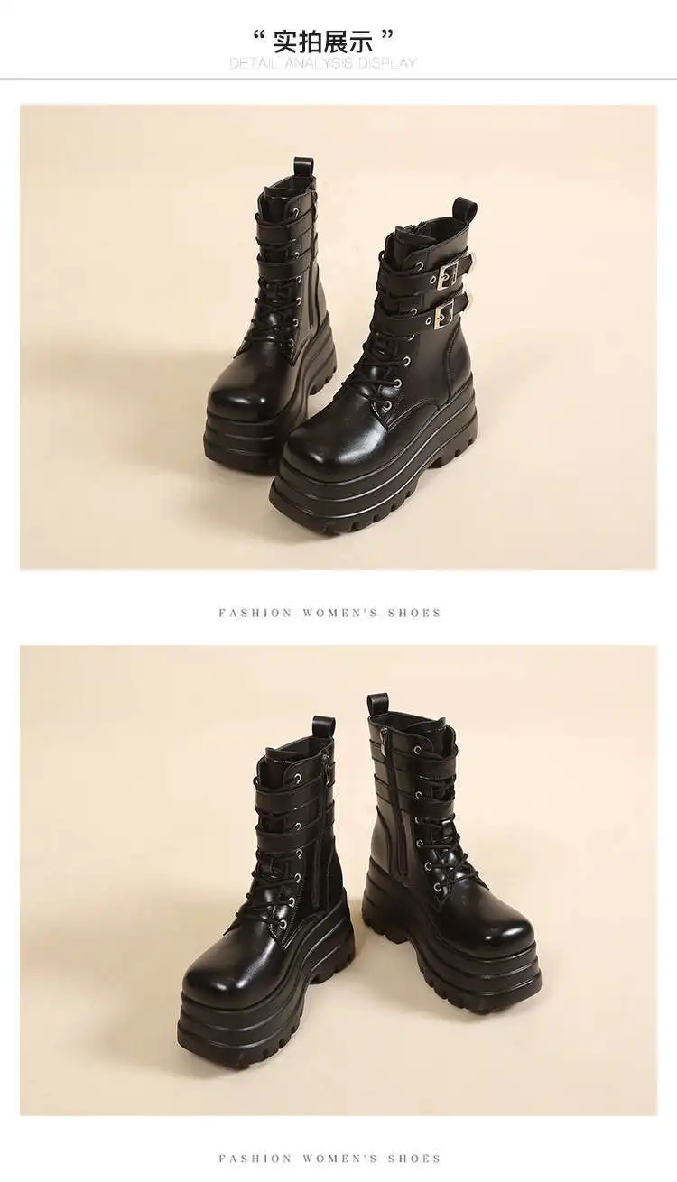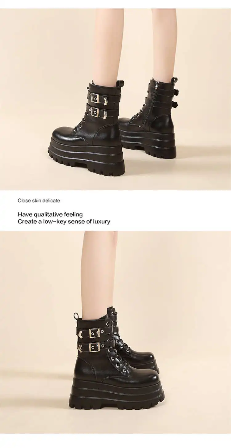 Women Boots British Belt Buckle 2025 Autumn New Height Increasing Thick Soled Short Boot Lace Up Zipper Fashion Motorcycle Boots