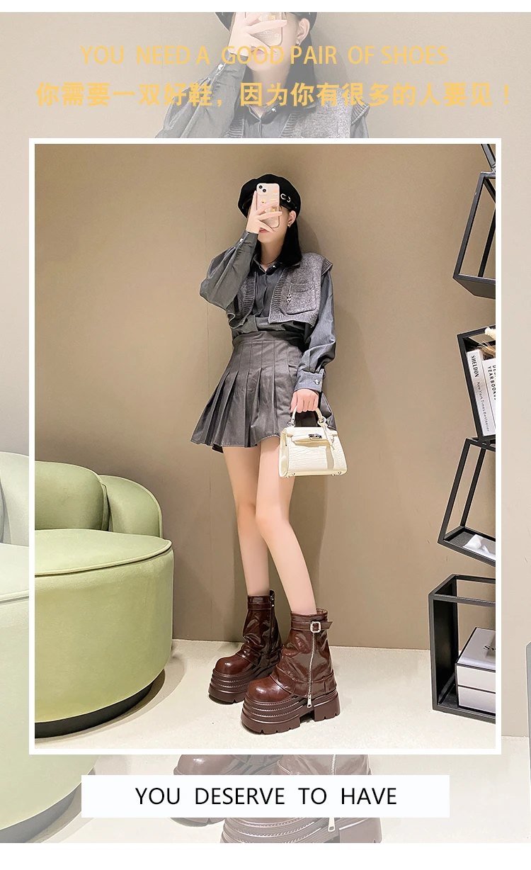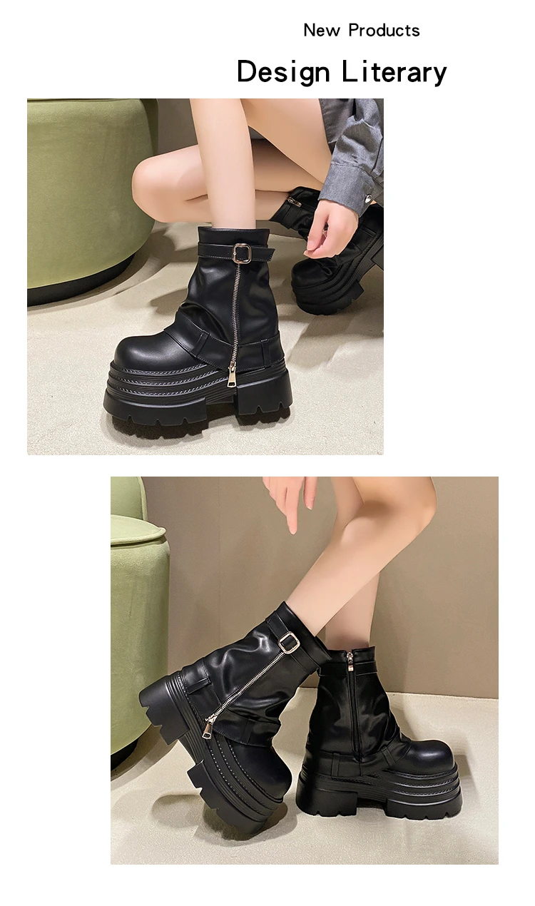 Women's Autumn Winter Leather Ankle Boots 10CM Heels Chunky Platform Combat Boots New Non Slip Motorcycle Shoes Woman Punk Boots