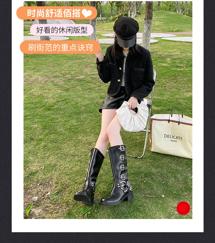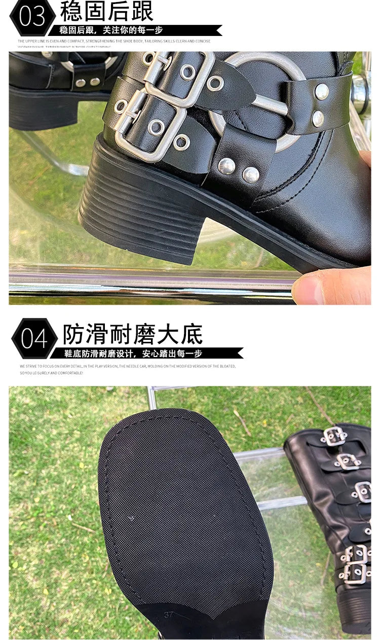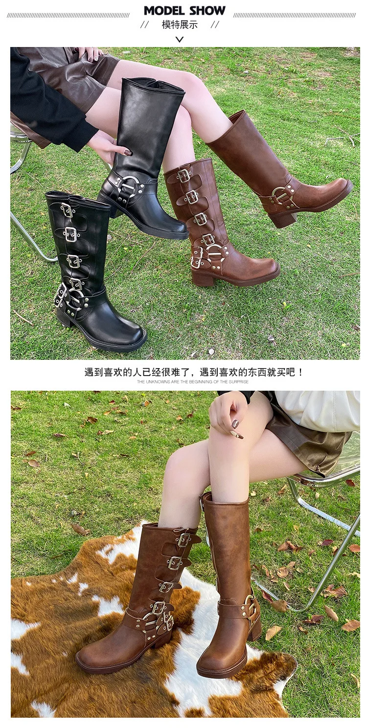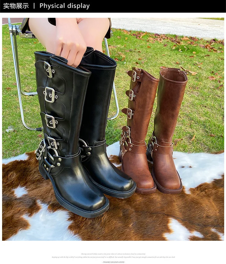 Women's High Platform Boots Metal Buckle Thick Heel Motorcycle Boots Vintage Soft Leather Punk Boot Brown Leather Knight Boot