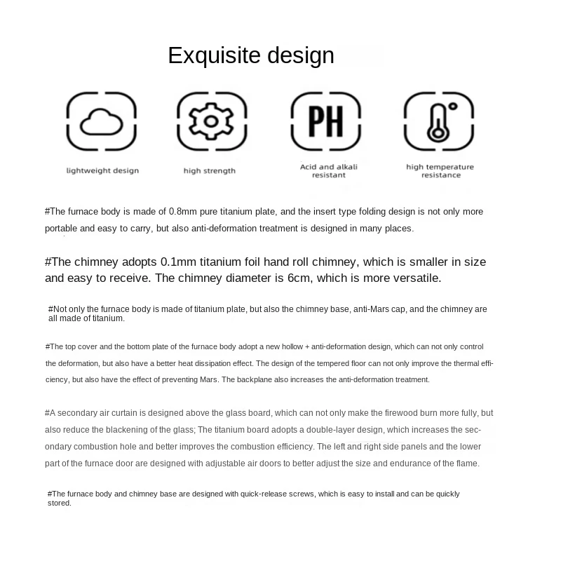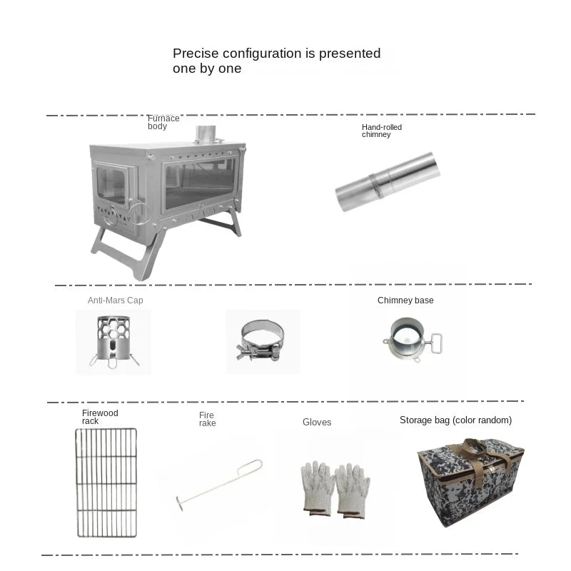 Packing box includes: 1* titanium furnace, 1* titanium foil chimney, 1* chimney regulator, 1* hoop, 1* spark guard, 1* wood hook, 2* gloves, 1* tote bag